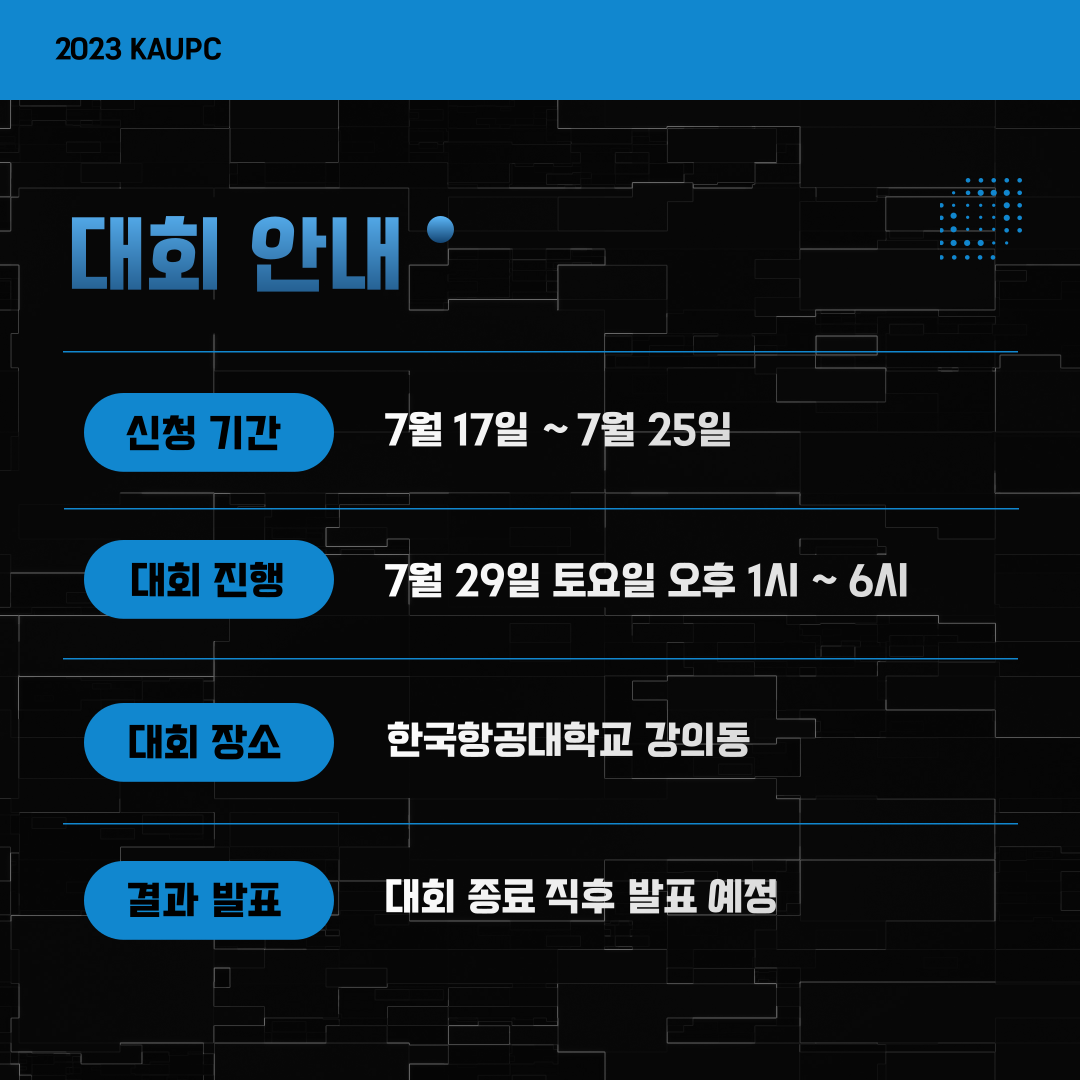 대회는 7월 29일 백준 온라인저지를 이용해 진행되었으며 총 57명이 참가하였다. 대회는 항공대학교 강의동 108호에서 대면으로 이루어졌다.