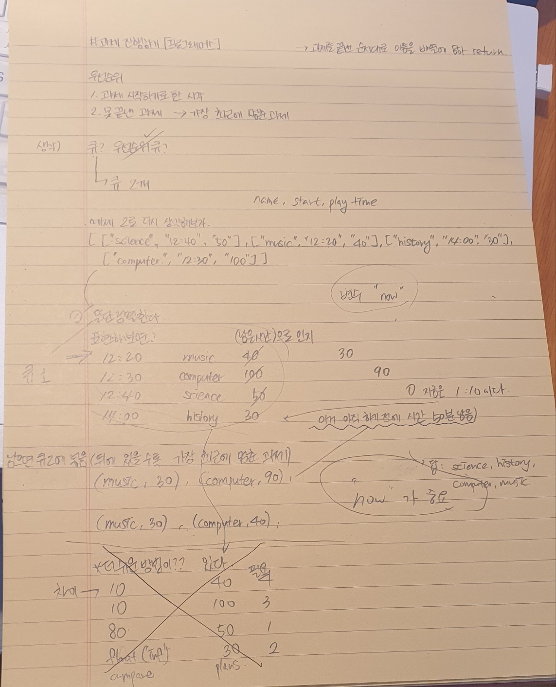 빡구현 문제로 뒤에 오는 과제를 확인하는 동시에 남은 시간이 있다면 내가 처리할 수 있는 못 끝낸 과제들을 확인하면 된다. 사실상 못 끝낸 과제들은 '가장 최근에 멈춘 과제'를 먼저 처리하기 때문에 stack 구조로 FILO 구조를 사용하여 구현하면 된다.