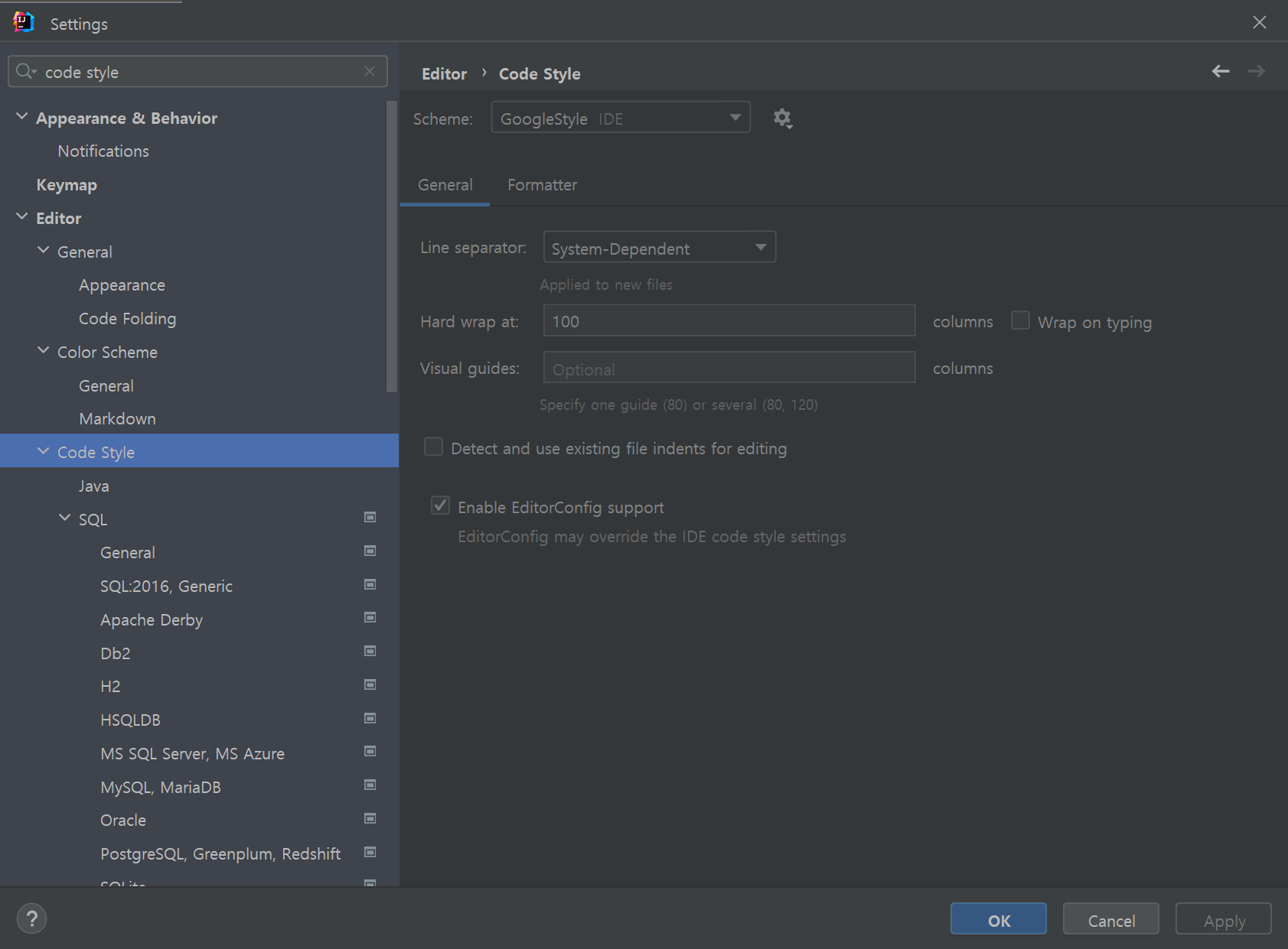 1. Files > Settings > Code Style에 Scheme이 GoogleStyle로 변경되었는지 확인해보자!