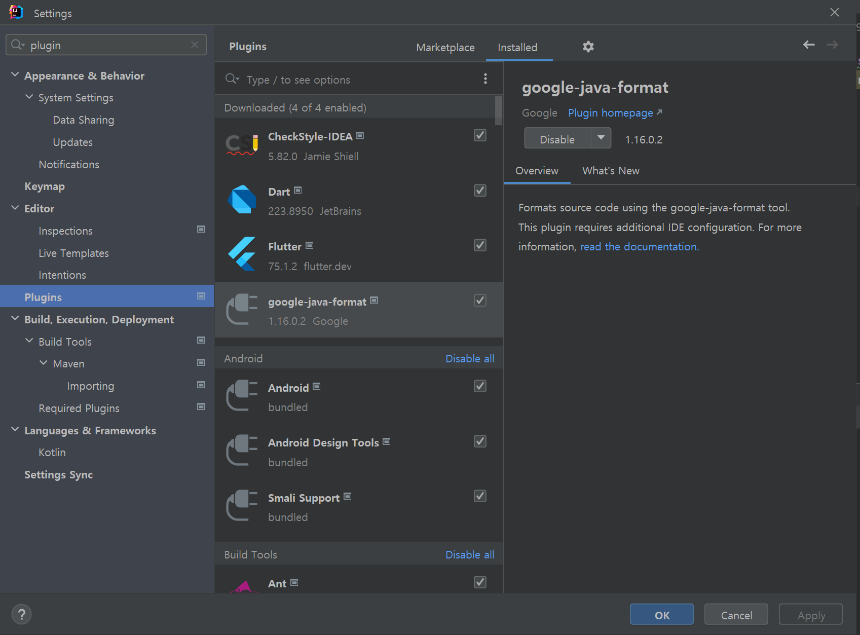 1. IntelliJ > Files > Settings에서 google-java-format을 다운받아 Enable시킨다. (Enable 시키면 아래처럼 Disable 로 나타나게 된다)