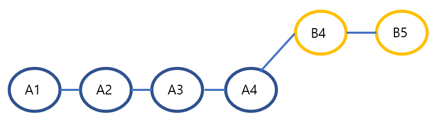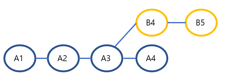 기존 A브랜치가 develop이고 내가 B에서 작업하고 있었다. 새로운 변경사항 A4가 만들어졌다면