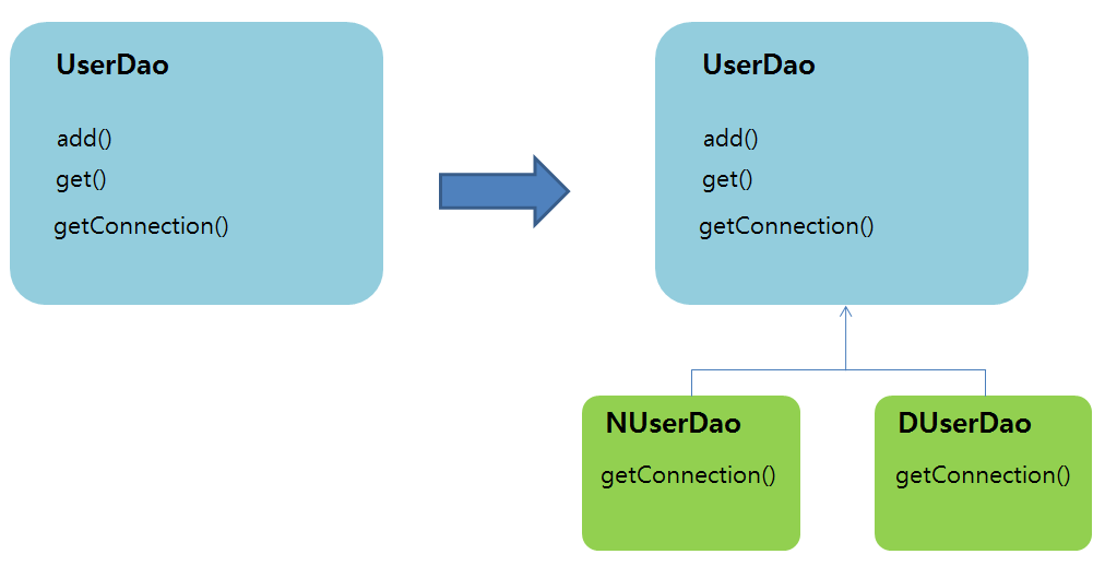 이번에는 직관적으로 와닿을 수 있는 설명인데, 관심사가 다르고 변화의 성격이 다른 UserDao속 add, get (User를 추가하고 가져오는 함수이겠다) 와 DB connection을 맺는 로직을 완전히 분리할 것이다.