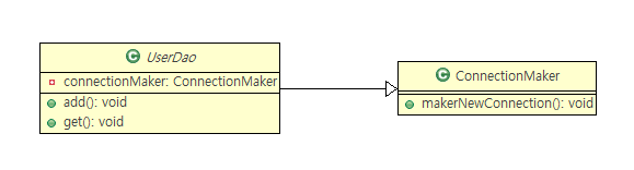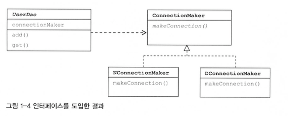 UserDao에서는 그저 makeNewConnection(); 메서드를 호출하기만 하면 되고, Connection 타입의 오브젝트는 알아서 만들어 돌려줄 것이라고 기대할 수 있다.