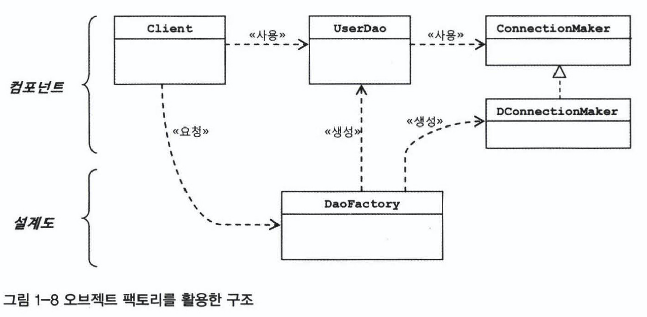 앞에서 우리는 UserDaoTest에 DB 연결에 대한 책임(ConnectionMaker 구현 클래스)을 던져버렸다. 이번에는 이 책임을 DaoFactory로 분리해보자.