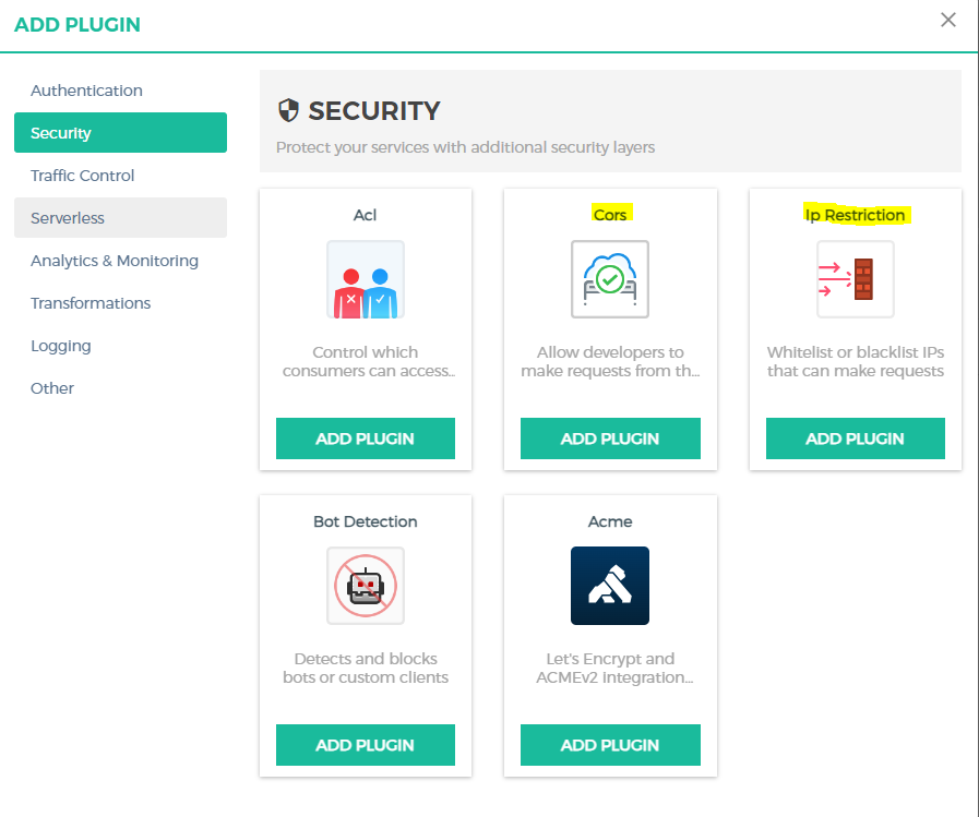 이 외에도 Cors나 Ip Restriction 등 보안 관련 여러 플러그인을 제공하고 있다.