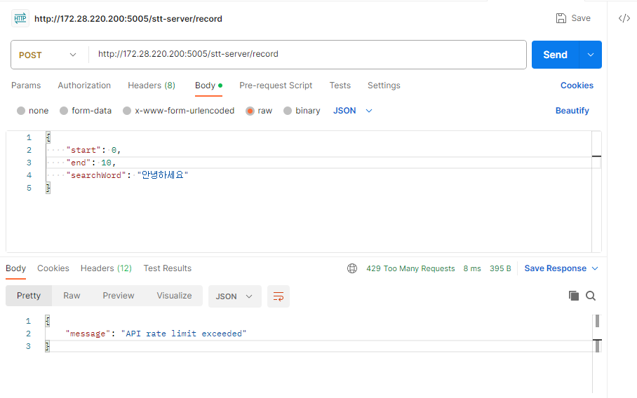 아래와 같이 POSTMAN에서 Send 요청을 와다다 눌렀을 때 4번째부터 아래와 같이 API rate limit exceeded로 터지게 된다.