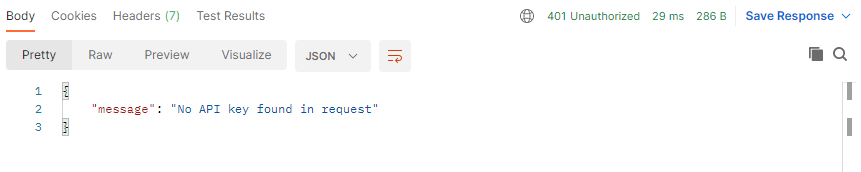 key 없이 접근하면 아래와 같이 Unauthorized 에러를 뱉는다.