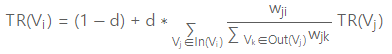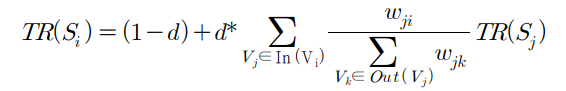 Wji는 정점 Si와 Sj 사이의 간선 가중치를 나타내고, In(Vi)는 단어 Vi와 연결되어 있는 모든 단어들의 집합, Out(Vj)는 단어 Vj와 연결되어 있는 모든 단어들의 집합이다. d는 제동계수로, PageRank에서 웹 서핑을 하는 사람이 현재 페이지에 만족하지 못하고 다른 페이지로 가는 링크를 클릭할 확률로 0.85를 사용한다.