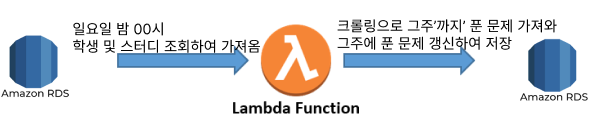 맞은 문제 리스트를 매주 일요일마다 크롤링하여 일주일마다 푼 문제를 DB에 저장한다. 그렇다면 이번주에 푼 문제 개수는 [이번주까지 푼 문제-저번주까지 푼 문제]로 적용할 수 있다.