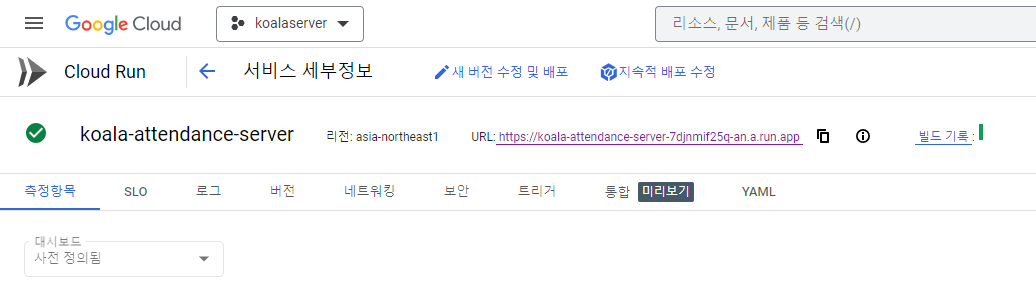 서비스 세부정보의 이미지 URL이 아래와 같이 내가 설정한 gcr.io/koala-409707/koala-attendance-server:$COMMIT_SHA 이 아니라 gcr.io/cloudrun/placeholder~로 시작하는 것으로 보였다.