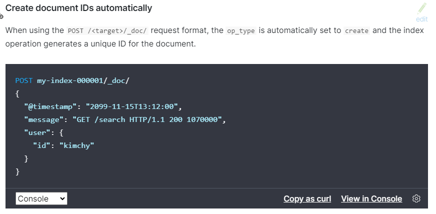 이 때 ID를 굳이 지정해주지 않으면 ID를 자동으로 생성해주는 POST 형태에 해당한다. <인덱스명>/_doc까지만 입력하게 되면 자동으로 임의의 id가 생성된다. ( 예를 들면 이런 형식 - "_id" : "ZuFv12wBspWtEG13dOut" ).