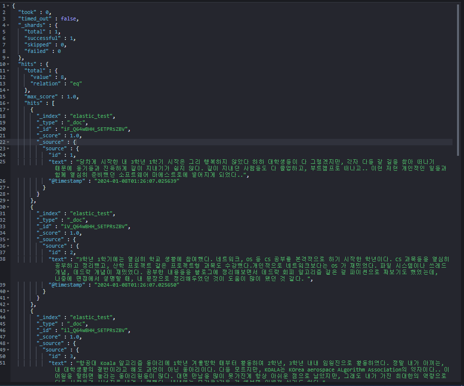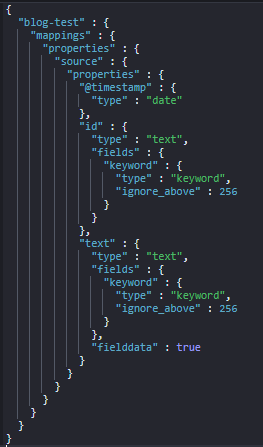 엘라스틱서치는 동적 매핑을 지원하기 때문에 도큐먼트 추가 시 자동으로 매핑이 가능하다는 특징이 있다. 내 docs는 JSON 형태로 id, text, @timestamp 의 세 가지 값들을 추가하고 있다. 각각의 type은 text, text , date 이다. 앞에서 내가 정의한 text는 변수명이다.. 헷갈려서 바꿔야할 필요가 있겠다,,