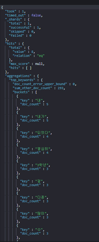 아래와 같이 key로는 term을 반환하고 doc_count 로는 해당 단어를 가진 docs의 갯수를 반환한다.