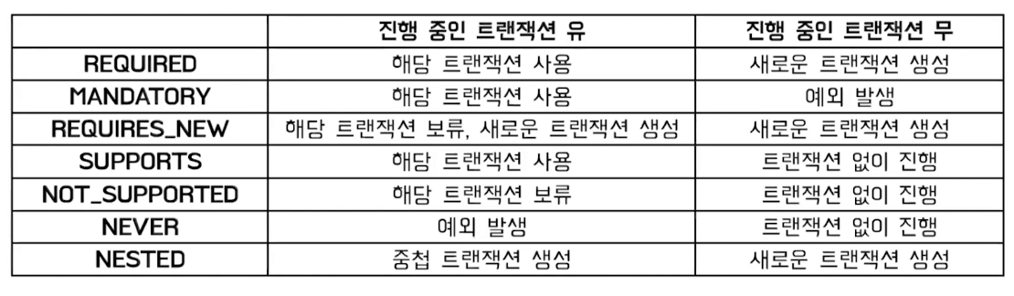 MANDATORY의 경우, 메소드가 호출되는 시점에서 이미 실행 중인 다른 트랜잭션이 있어야 함을 의미한다. 그렇지 않으면 예외가 발생한다.