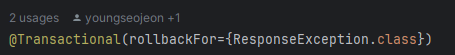 만약 Exception(을 상속한 ResponseException)이 일어나 롤백이 필요한 상황이라면 아래와 같이 해당 Exception이 일어난다면 rollback하도록 명시해주어야 한다 !! 일단 불안해서 명시해주었다 ..😬