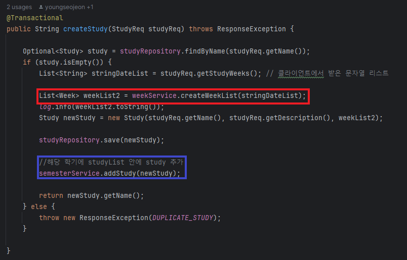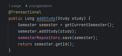weekService.createWeekList와 semesterService.addStudy 메소드를 호출하고 있다. newStudy를 저장한 이후 semesterService를 통해 study를 추가하고 있다.