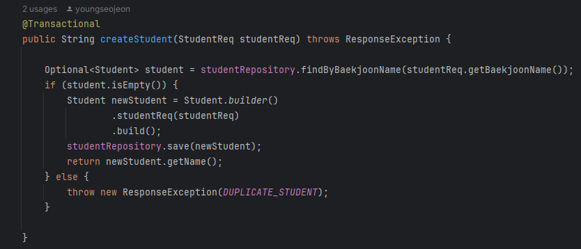 그렇다면 addStudy 메소드를 확인해보자. 다행히,, 해당 메소드에서는 DB 데이터가 아닌 단순 날짜 조회 메서드들로 이루어져 있어 Exception이 나는 상황이 존재하지 않았다. 👏