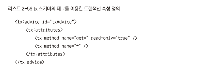 첨언) aop와 tx 스키마의 태그를 이용해 빈으로 경계설정을 적용한다면, get 으로 시작하는 메소드들에 공통적으로 같은 종류의 전략을 적용시킬 수 있다는 장점이 있다고 한다. 이 때, 어드바이스와 포인트컷을 사용하여 어떤 부가 기능(어드바이스)을 어떤 클래스/메소드에 적용할지(포인트컷) 안할지 적용하는 과정이 필요하다.