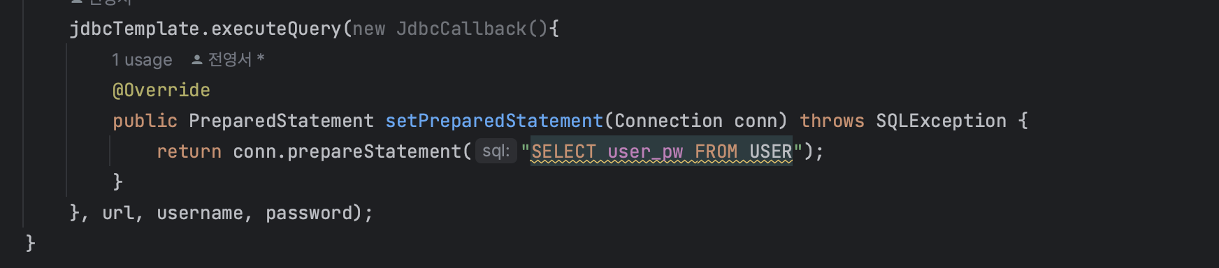 다음으로는 변하는 부분과 변하지 않는 부분을 나누어주었다. 이 때 SQL(변하는 부분)은 template에서 parameter로 넘겨서 구현했기에 사실상 뒷단에서 실행되는 '콜백' 형태를 만족시키지는 않는다.