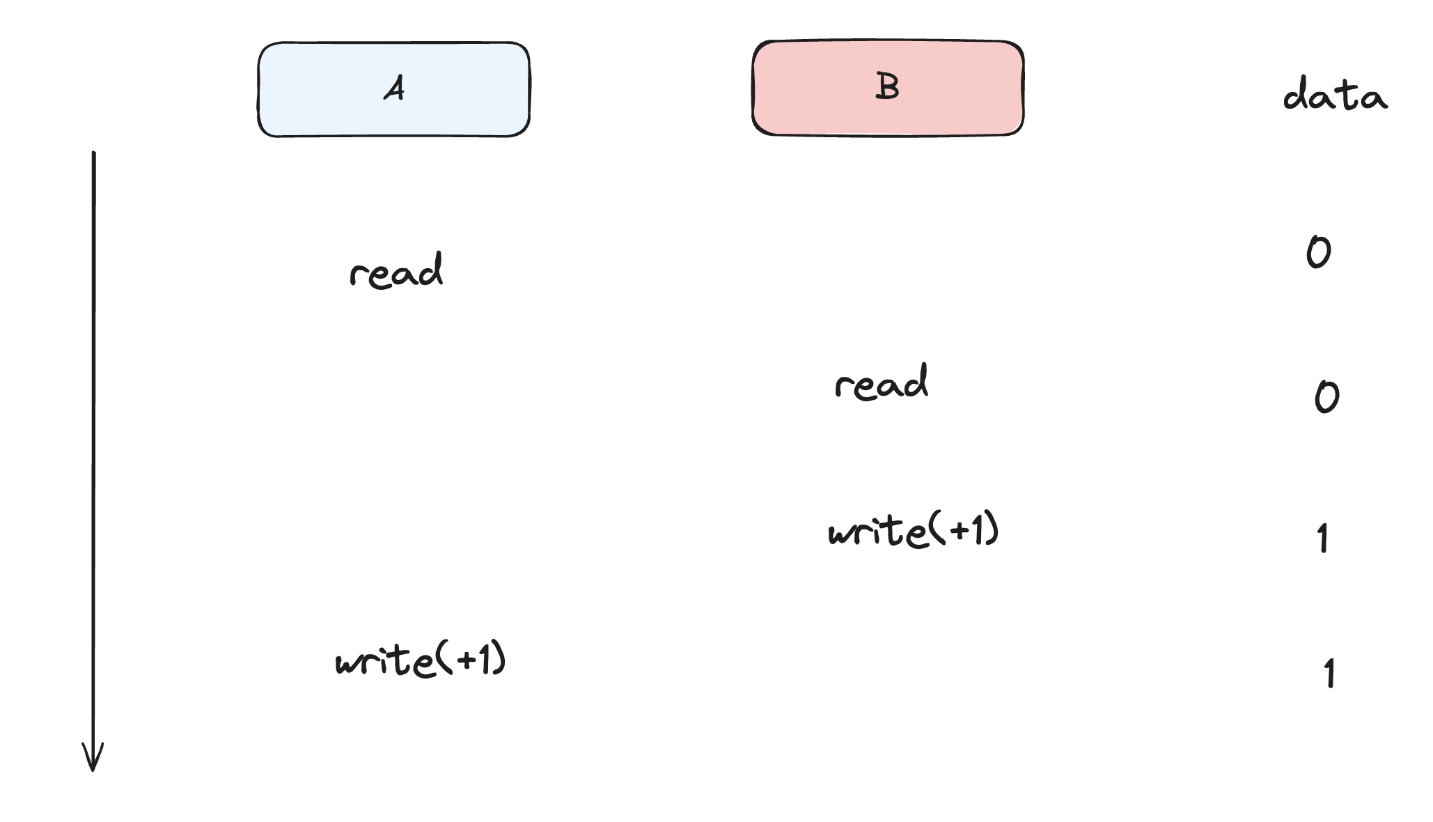 Tomcat(Java/SpringBoot)와 같은 멀티쓰레드 환경에서 트랜잭션 격리 수준으로 온전히 해결되지 않는 동시성 문제가 있다. 바로 Lost Update 현상이다. 아래 예시를 살펴보자. A 트랜잭션이 data를 0으로 읽었고, B 트랜잭션이 끼어들어 data를 0으로 읽었다. (잘못 읽었음에도) A는 +1 연산을 수행하고 B 또한 +1 연산을 수행한다. 최종적으로 원한 값은 2였으나 Update 하나를 잃어버려 +1의 결과값을 갖게 되었다.