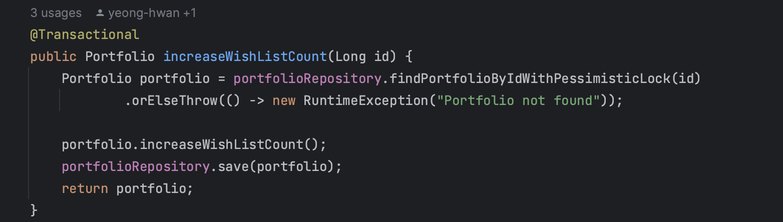아래는 Member가 WishList를 추가하는 과정에서 Portfolio에 wishListCount 필드를 +1 해주는 과정이다.
