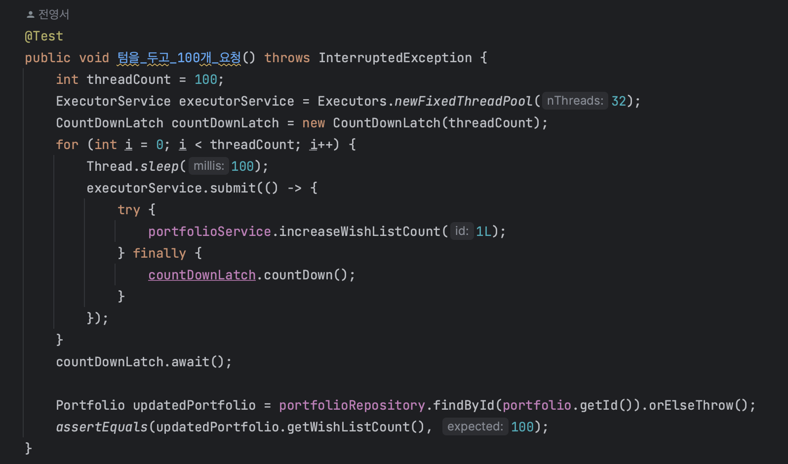 //assertEquals(updatedPortfolio.getWishListCount(), 100); -> 100이 아닌 경우가 발생