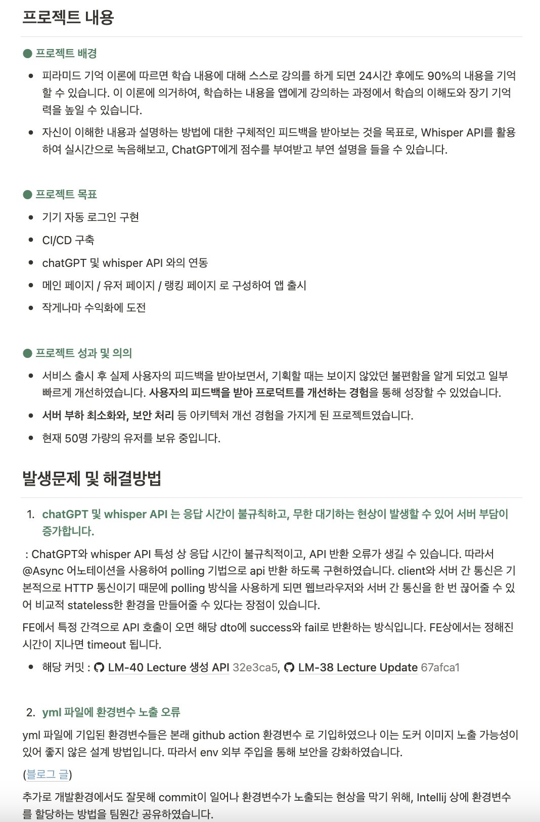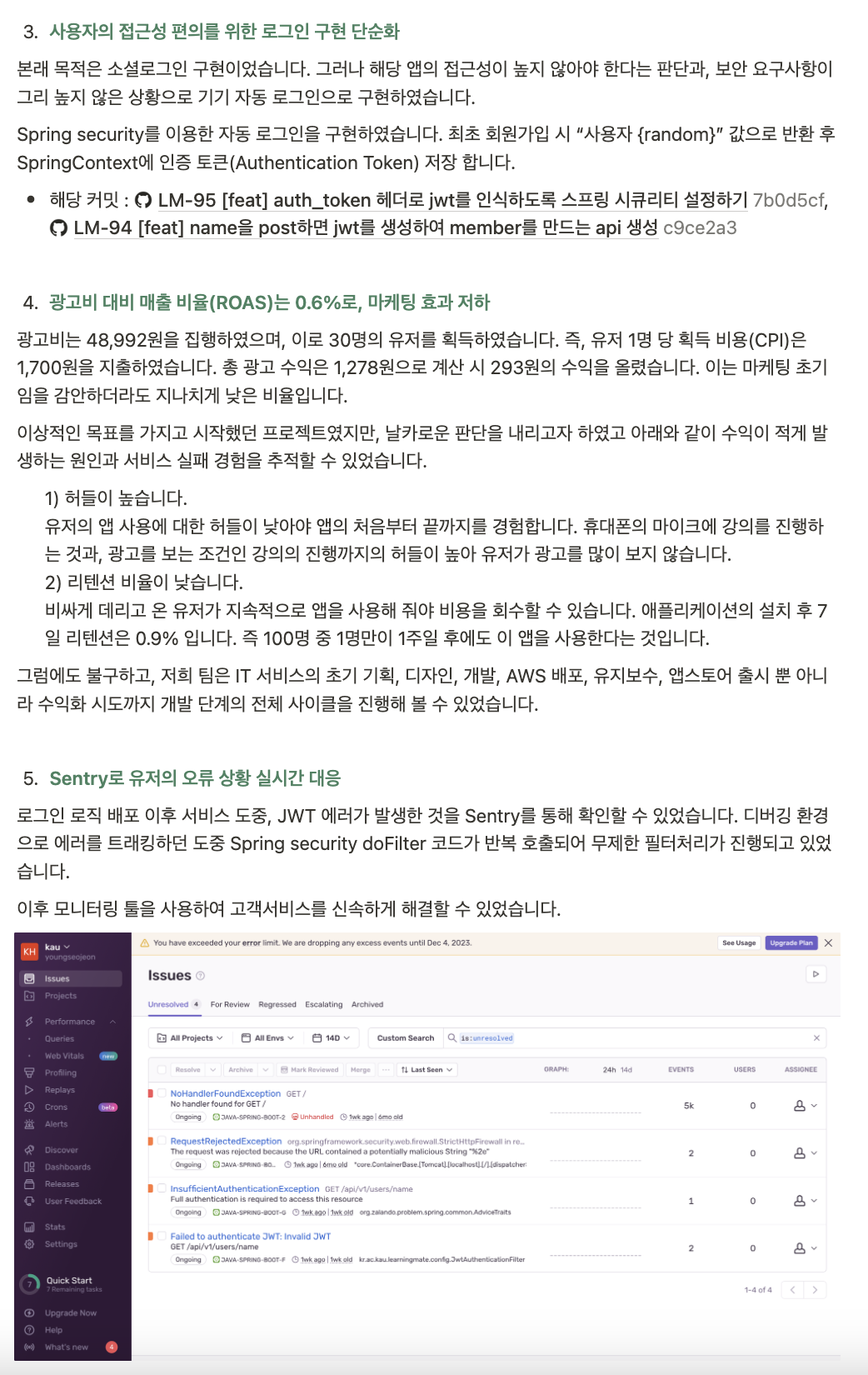 적은 사용자이긴 하지만 프로젝트를 진행하면서 고민했던 정말 작은 부분까지 꼼꼼하게 잘 적으려 노력했다. 코틀린/스프링으로 진행했기에 전형에 더 유리했다고 생각된다.
