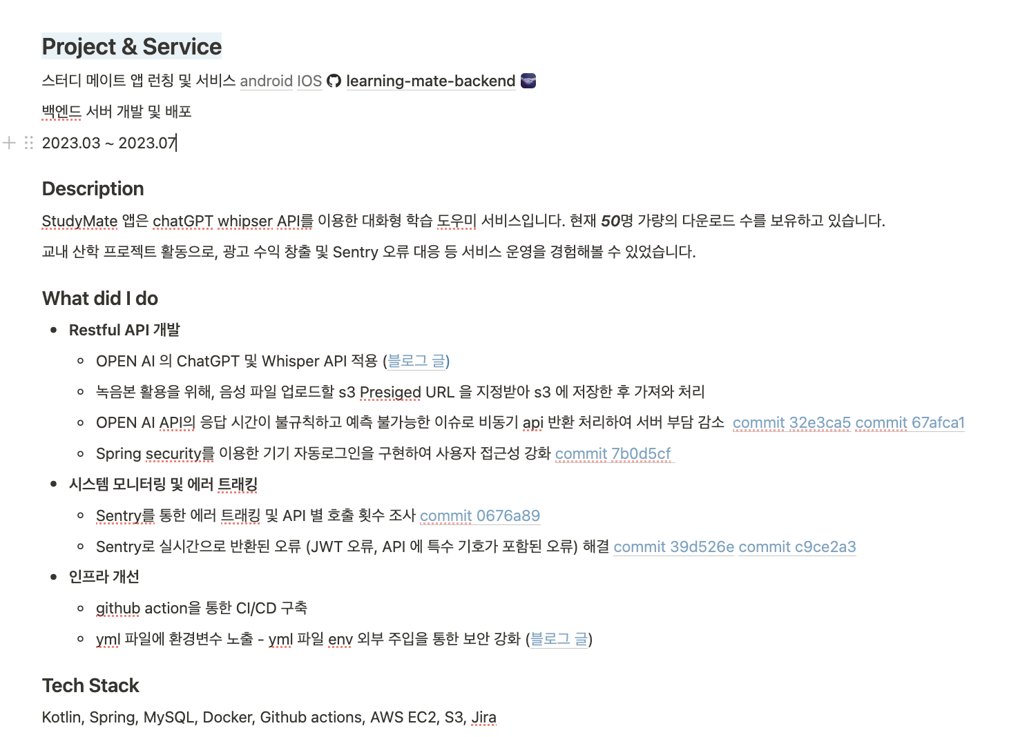 포트폴리오는 소마 면접 때 제공받은 노션 틀을 그대로 사용하였고, 프로젝트 별로 내용 -> 발생 문제 및 해결방법 -> 아키텍처 순서대로 상세하게 기록하였다. 이력서에는 프로젝트 별 주요한 내용들만 뽑아 요약한 후 자세한 사항들은 커밋이나 포트폴리오 주소를 달아 표기하였다.
