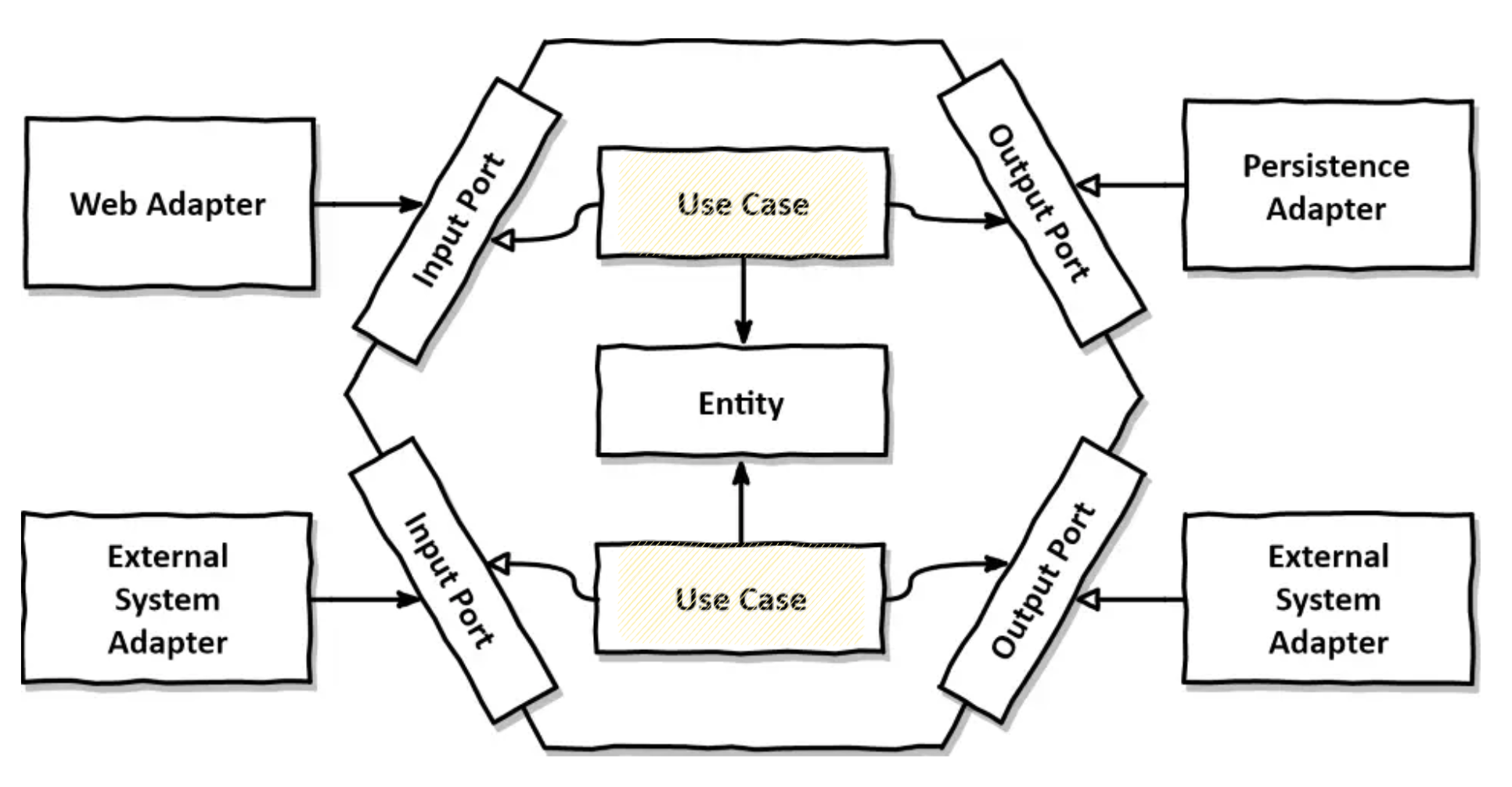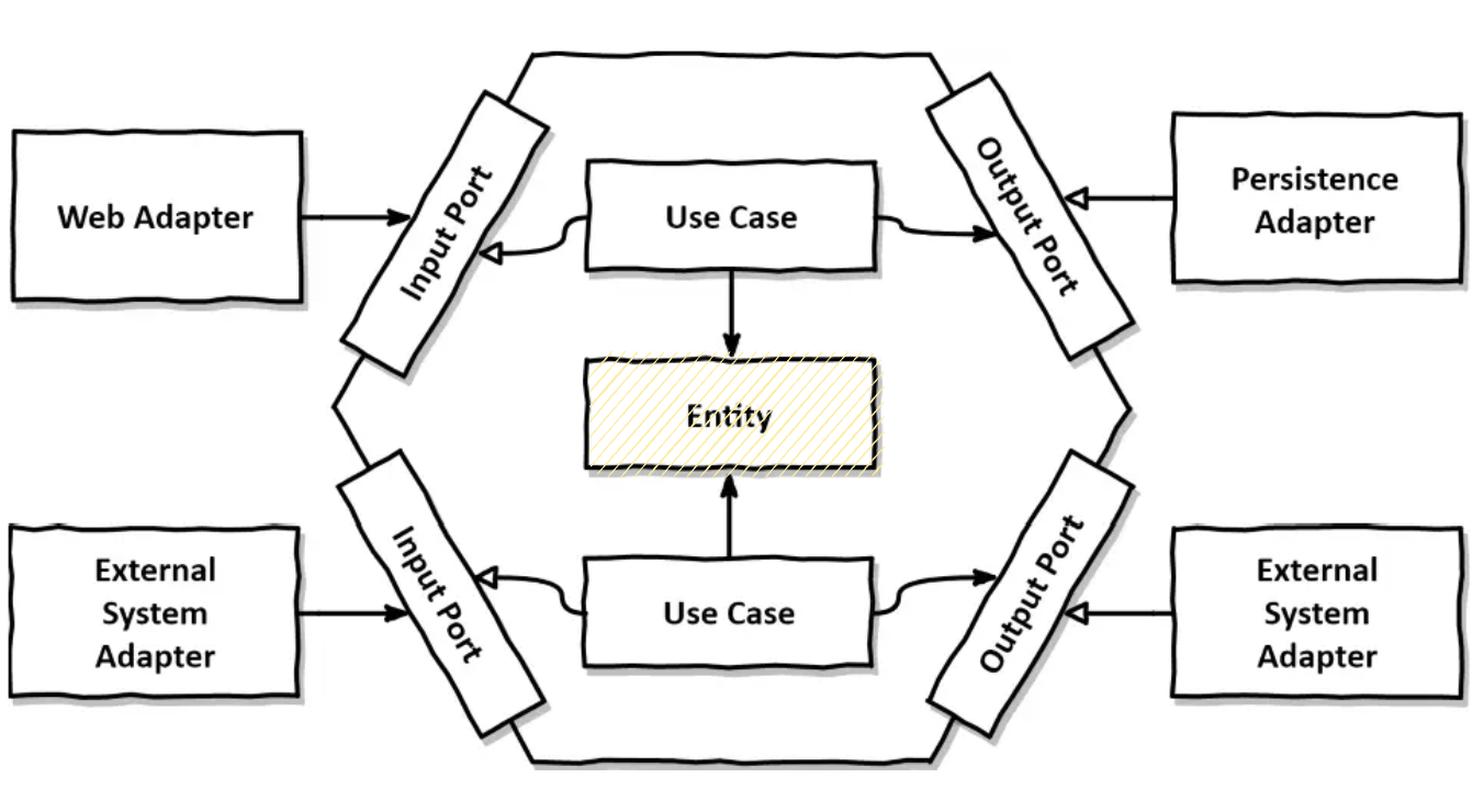 위 그림에서 볼 수 있듯이, 육각형에서 외부로 향하는 의존성이 없기 때문에 로버트 마틴이 클린 아키텍처에서 제시한 의존성 규칙이 그대로 적용된다. 크게 어댑터 / 어플리케이션 (포트와 유스케이스) / 엔티티 으로 나누어져 있다.