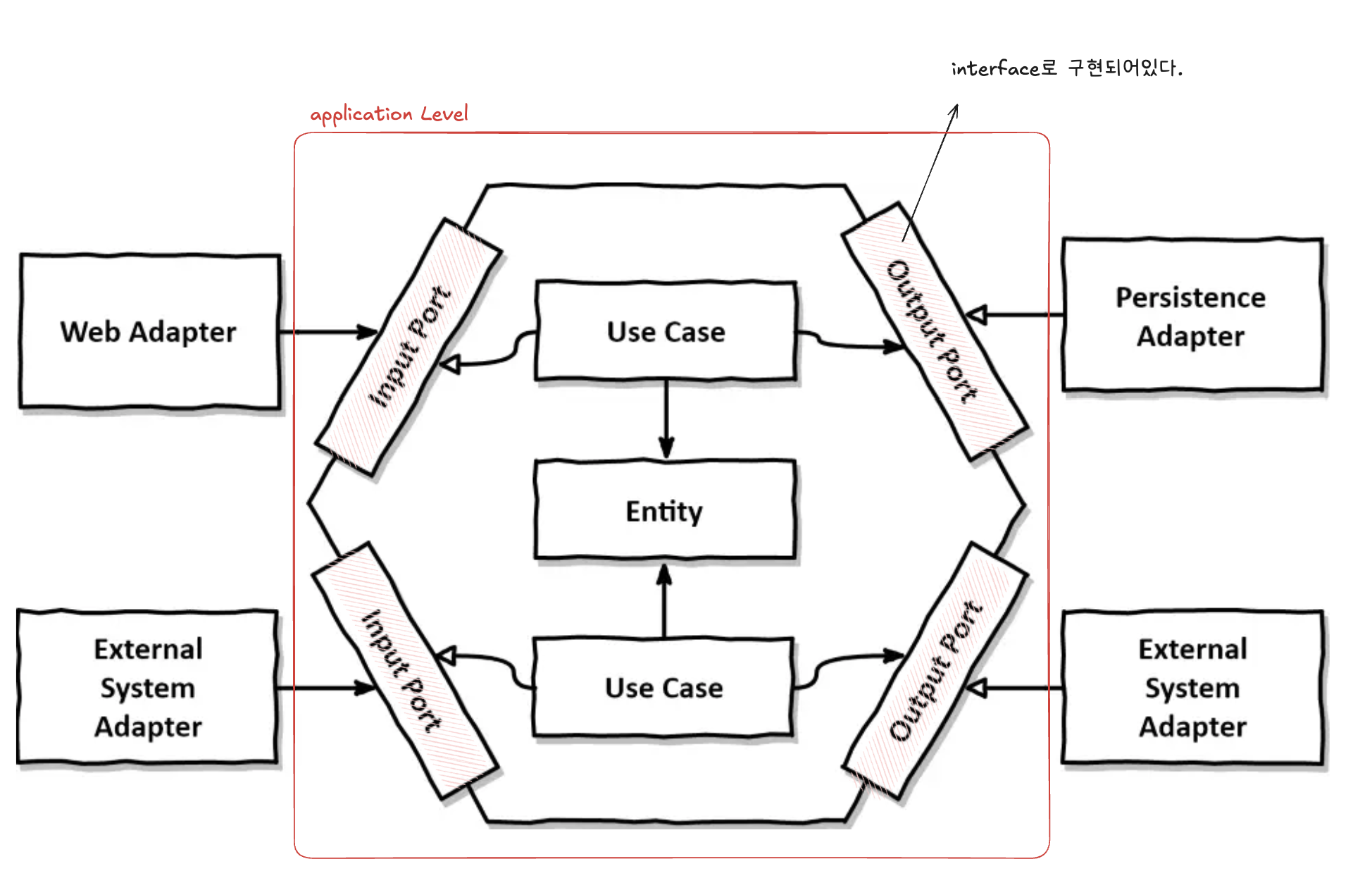 - port 는 인터페이스 형태로 구현한다. application 레벨의 핵심은 in/out 어댑터에 의존성을 갖지 않는 것이다. 따라서 인터페이스를 이용해 비즈니스 로직에서 외부 시스템과의 상호작용을 추상화한다.