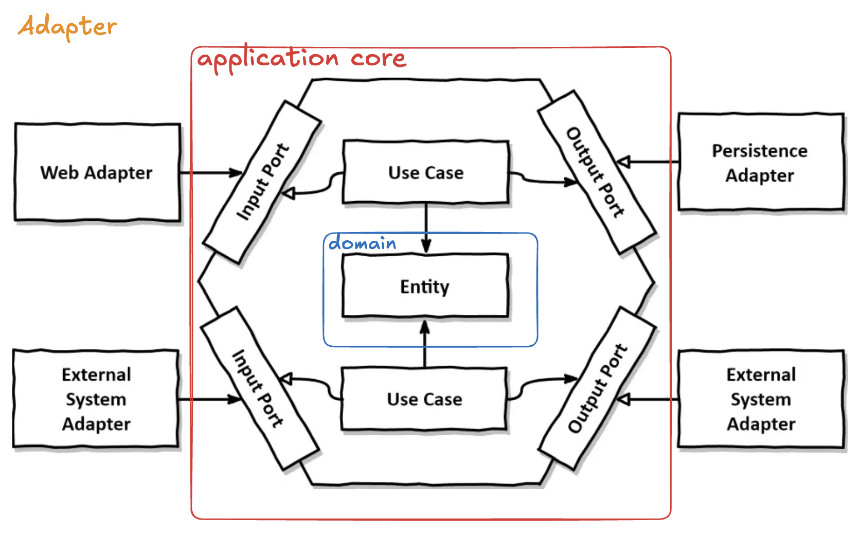 - adapter는 크게 두 개 (in port와 out port)로 나뉜다. port명에서도 알 수 있듯이, 밖으로 나가는 것과 안으로 들어오는 것을 의미한다.