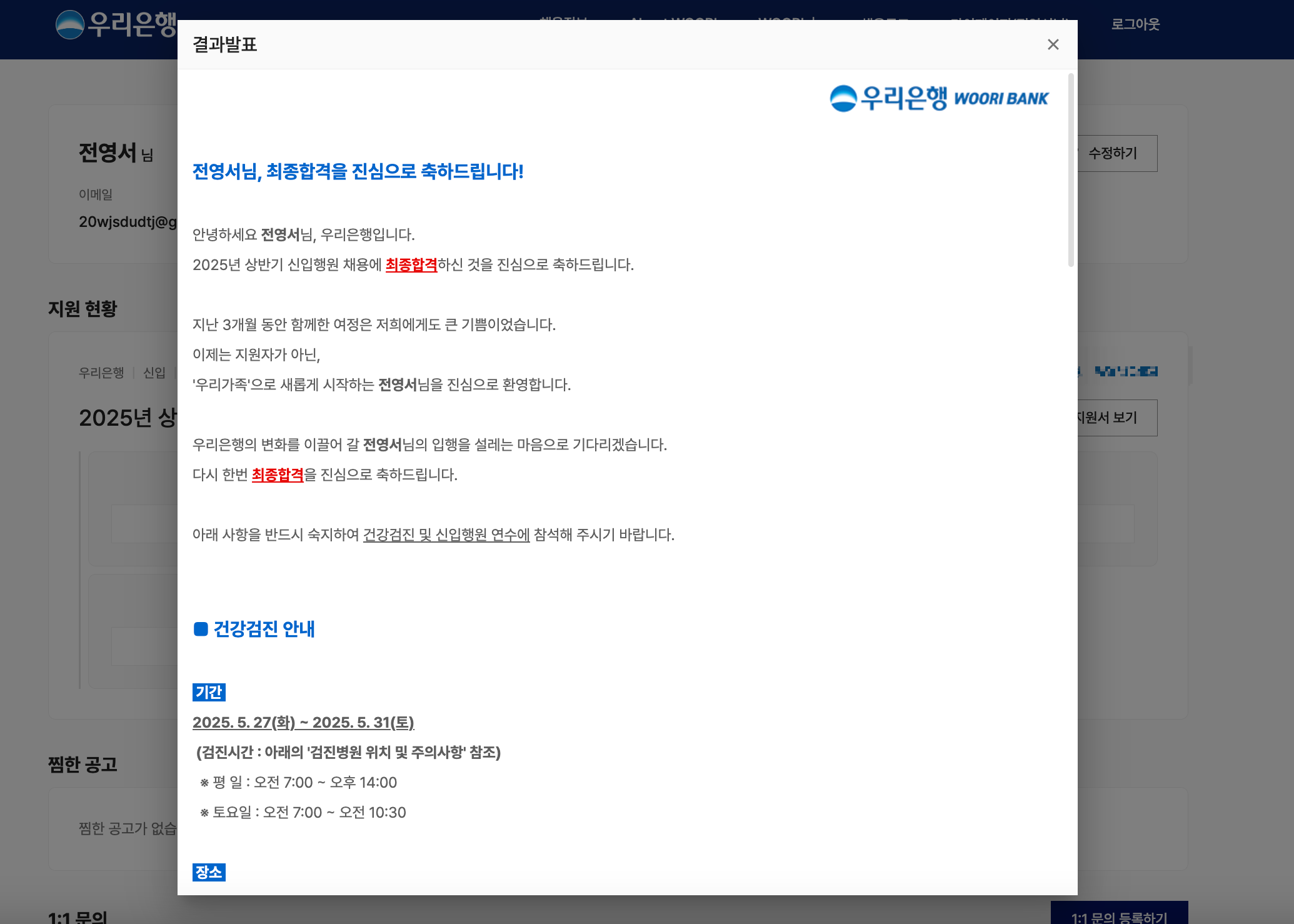 제가 생각하는 저의 합격 당락을 결정한 부분은 포트폴리오 파트였다고 생각합니다. NICE 신용정보 회사에서 진행했던 AICC 프로젝트를 정말 좋게 봐주셨고 두 분께서 동시에 미소짓는 모습을 볼 수 있었기에 분위기가 매우 좋았습니다. AICC 프로젝트가, 정말 처음부터 끝까지 엄청 고생해서 만들었기도 하고, 보상도 칭찬도 많이 받았던 프로젝트였는데 우리은행에서 그걸 알아봐 주셔서 너무너무 감사했습니다 .. 🥲😭