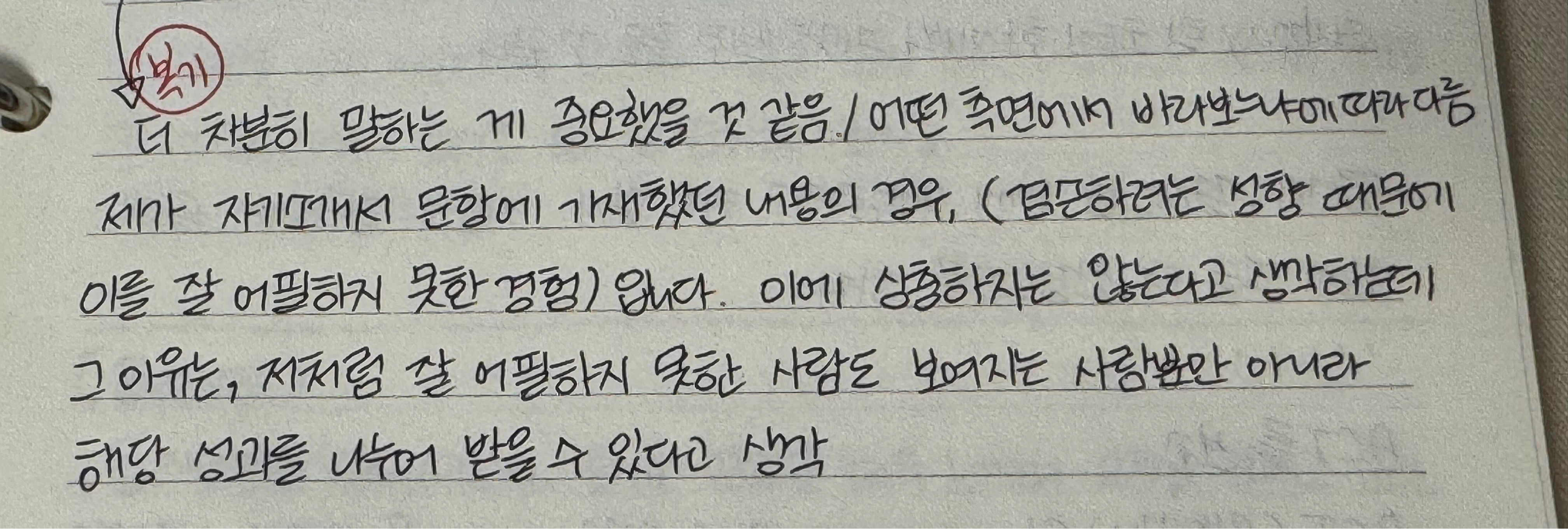 그래서 집에 와서 잠을 한 숨도 못자고, 저 순간만 되감기 100번을 하면서 일기에 하반기 때 어떻게 해야 할지 복기를 엄청 했습니다.. 아래는 제 복기 내용인데 아 이렇게 대답하는 게 더 나았을 것 같다.. 라는 리스트를 한 5개 ? 정도 쓰고 그 중에 추려 추려 추린 1위 대답이 아래 대답인 것 같습니다 ㅋㅋㅋ...
