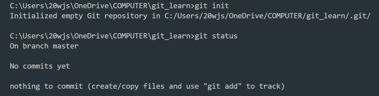 내가 원하는 폴더에 git을 처음 깔 때 git init 명령어를 사용해준다. 이후 우리는 master라는 브랜치에 있음을 알 수 있다.