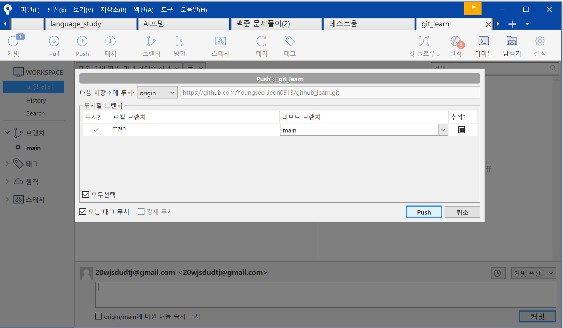 이 때 --set-upstream은 이후에 그냥 git push 명령어만 써도 되도록 한다. sourcetree에서는 push 버튼에서 main에 체크해주고 push 버튼을 누르면 끝난다!!