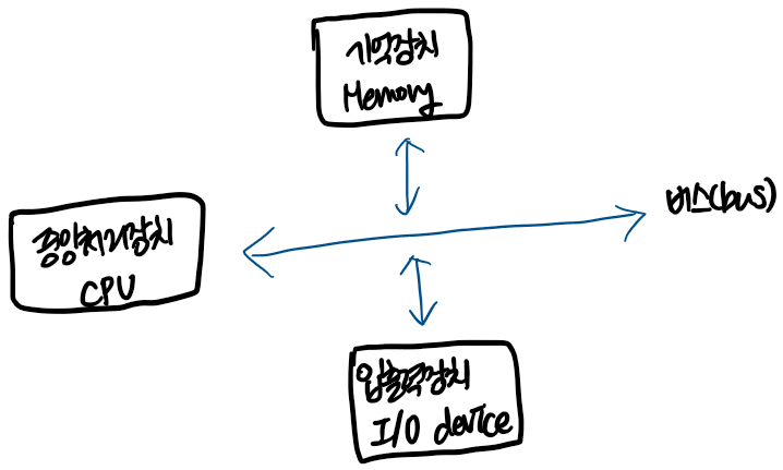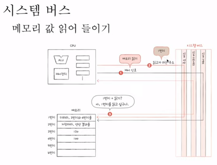 제어버스 - CPU가 시스템 내의 각종 요소들의 동작 제어를 위한 신호 선들의 집(쓰기 신호, 읽기 신호)