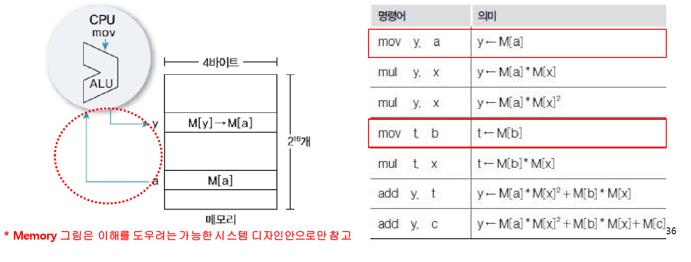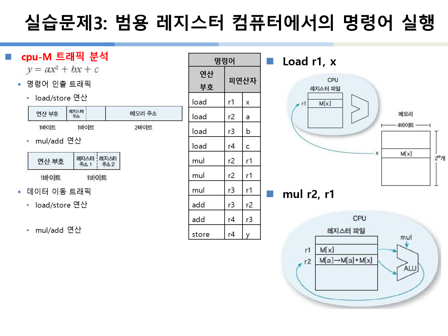 명령어 인출 트래픽 : 5(연산부호 1바이트+피연산주소1 2바이트+피연산주소2 2바이트)*7 (mov,mul,add,y,a,b,c) = 35