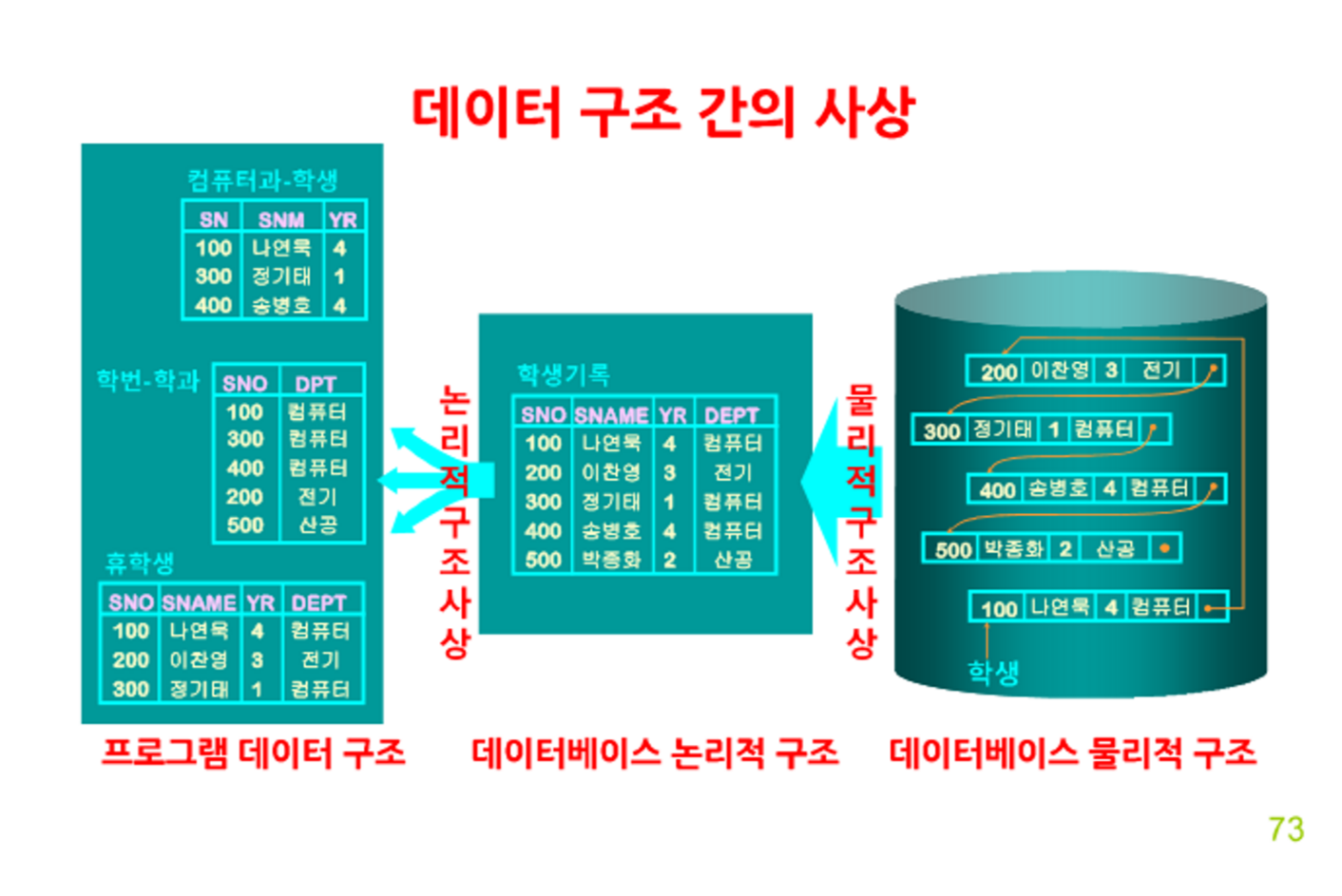 실제 데이터는 물리적 저장 장치에 저장된 DB에만 존재하므로 사용자가 DB에 접근하려면 외부 스키마 ———> 개념 스키마 ——→ 내부 스키마로 들어가야 한다. ★이 때 스키마들끼리 어떤 것들이 같은 것인지 유기적인 대응관계 표시가 필요하다.