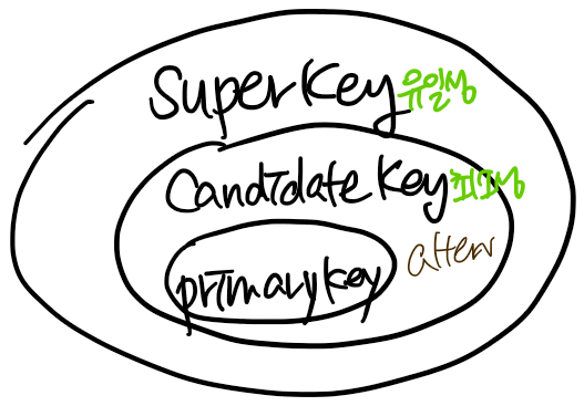 Super key-한 릴레이션 내에 있는 속성들의 집합으로 구성된 키. 유일성은 만족하나 최소성은 만족시키지 않음.