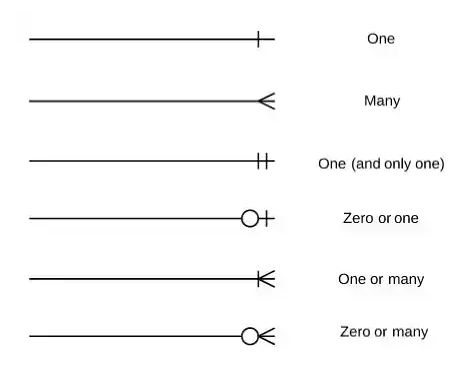 2. 관계 종류에 따라 1:1/1:M/N:M 을 잘 설정한다. 이 때 아래와 같은 기호를 사용할 수 있는데, 위 내용에는 포함시키지 못했다. 방법을 잘 모르겠다...무료버전이라 표시가 안되는 것 같기도 하고, 구글링 해서 딱히 정보가 나오지 않는다.