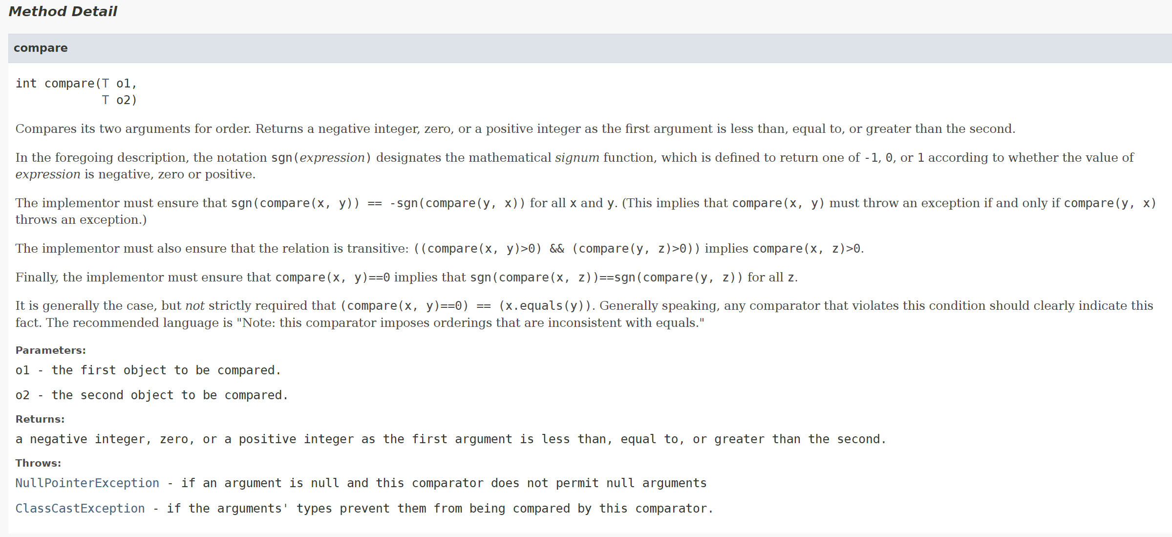comparator과 관련하여 java platform을 보면 다음과 같이 parameters를 지정하고 둘을 빼어 양수/음수/0을 이용해 무엇이 더 큰지 비교할 수 있다. x.compareTo(y)도 x-y와 같은 결과값을 도출한다.