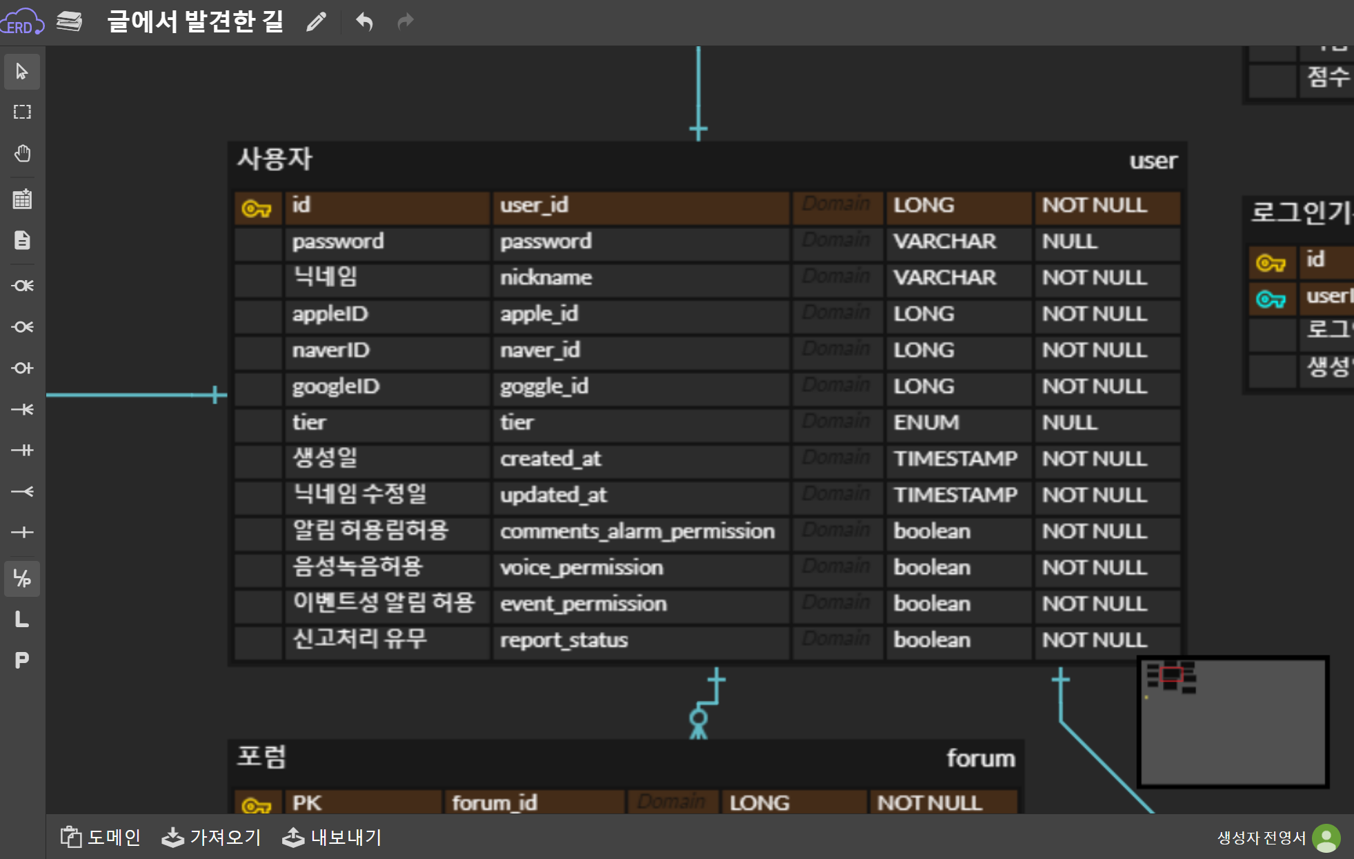 우리 글에서 발견한 길 팀은 GUI를 보면서 필요한 기능사항을 분석하여 ERD로 표현하였다.