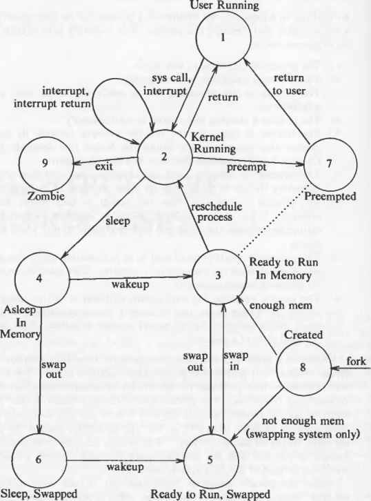 As outlined in Chapter 2, the lifetime of a process can be conceptually divided into a set of states that describe the proccss. The following list contains the