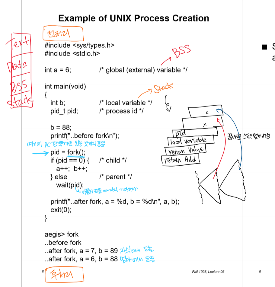 다만 다른 게 있다면 자식 process는 유일한 pid(process id)를 할당받아 pid로 구분지을 수 있다.