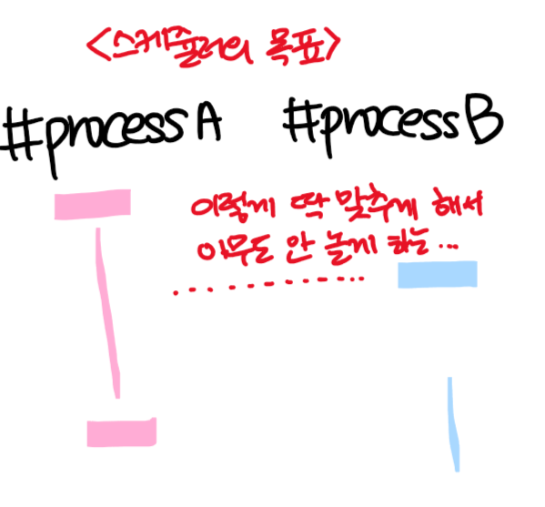 앞에서 우리는 다중프로그래밍에 대한 개념을 언급했다. 다중 프로그래밍은 쉽게 말해 아래 그림처럼 프로세스 중 아무도 놀지 못하도록 프로세스들을 조정한다는 개념이다.