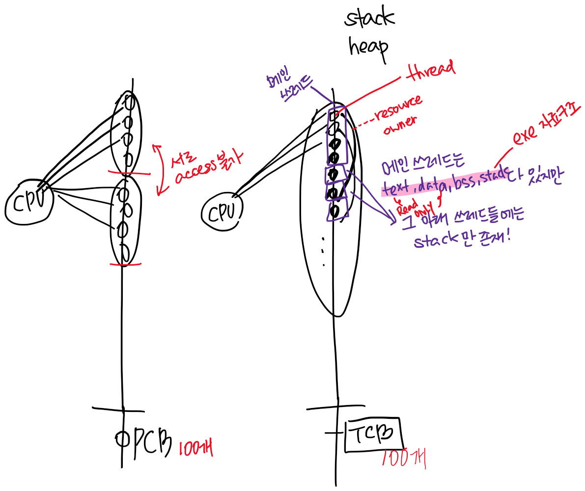 왼쪽 상황에서는 각각의 프로세스마다 별도의 text, data(data, bss) stack, heap 영역이 존재한다. 하지만 프로세스 한 개에 스레드 100개가 있는 오른쪽 상황에서는, 메인 쓰레드만 text, data(data, bss), heap을 모두 가지고 있고, 그 아래 쓰레드들에는 stack만 존재한다. 즉 text, data(data,bss), heap 영역은 메인스레드에만 존재하며 다같이 공유하고, stack만 스레드당 하나씩 존재하여 독립적으로 사용한다. !!