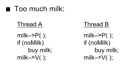 여기에서 문제는 "냉장고를 열어보니 우유가 없다"와 "우유를 사서 냉장고에 넣는다"가 서로 원자성 연산이 아니기 때문에 나타난다. 쓸 데 없이 우유가 너무 많아질 수 있다.