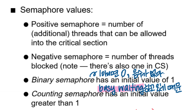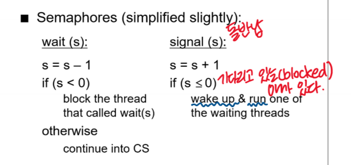 - busy waiting을 이용하여 세마포 구현 (앞에서 본 내용이다.)