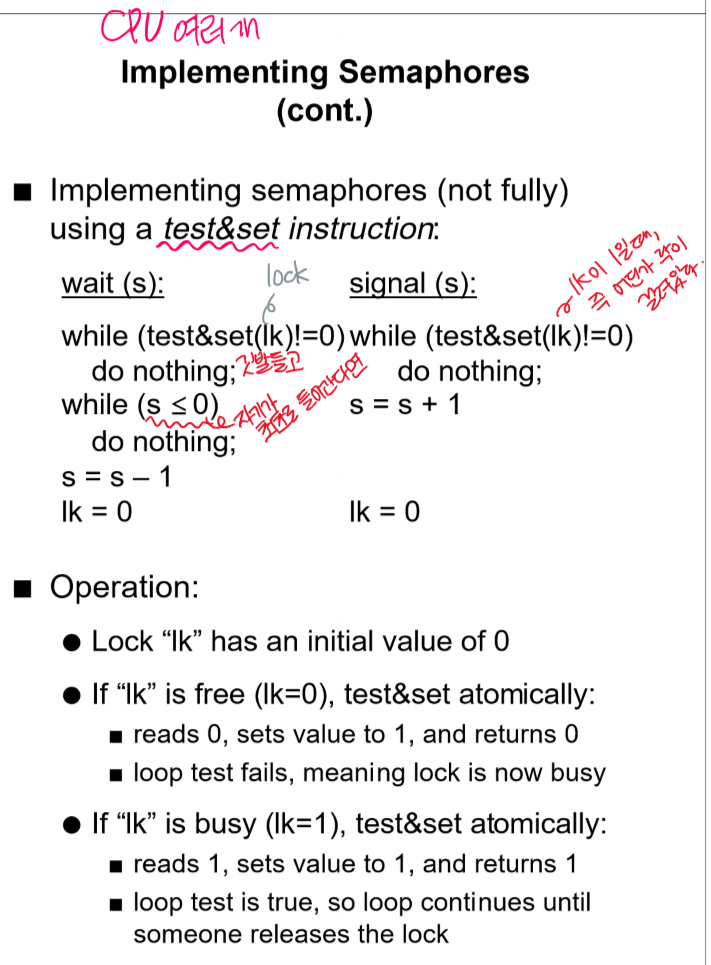 interrupt를 disable시키는 방식은 세마포 변수에 대한 접근을 원자적으로 수행하도록 보장하며, 공유 자원을 사용할 수 없는 경우에는 다른 프로세스로 컨텍스트 전환이 일어난다. CPU 자원을 더 효율적으로 사용할 수 있습니다. - test&set 명령어를 사용하여 세마포 구현
