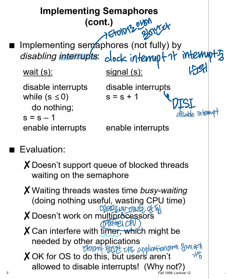 busy waiting은 프로세스가 다른 프로세스가 공유 자원을 사용하고 있을 때 계속해서 검사하는 방식이다. - interrupt를 disable시켜 세마포 구현